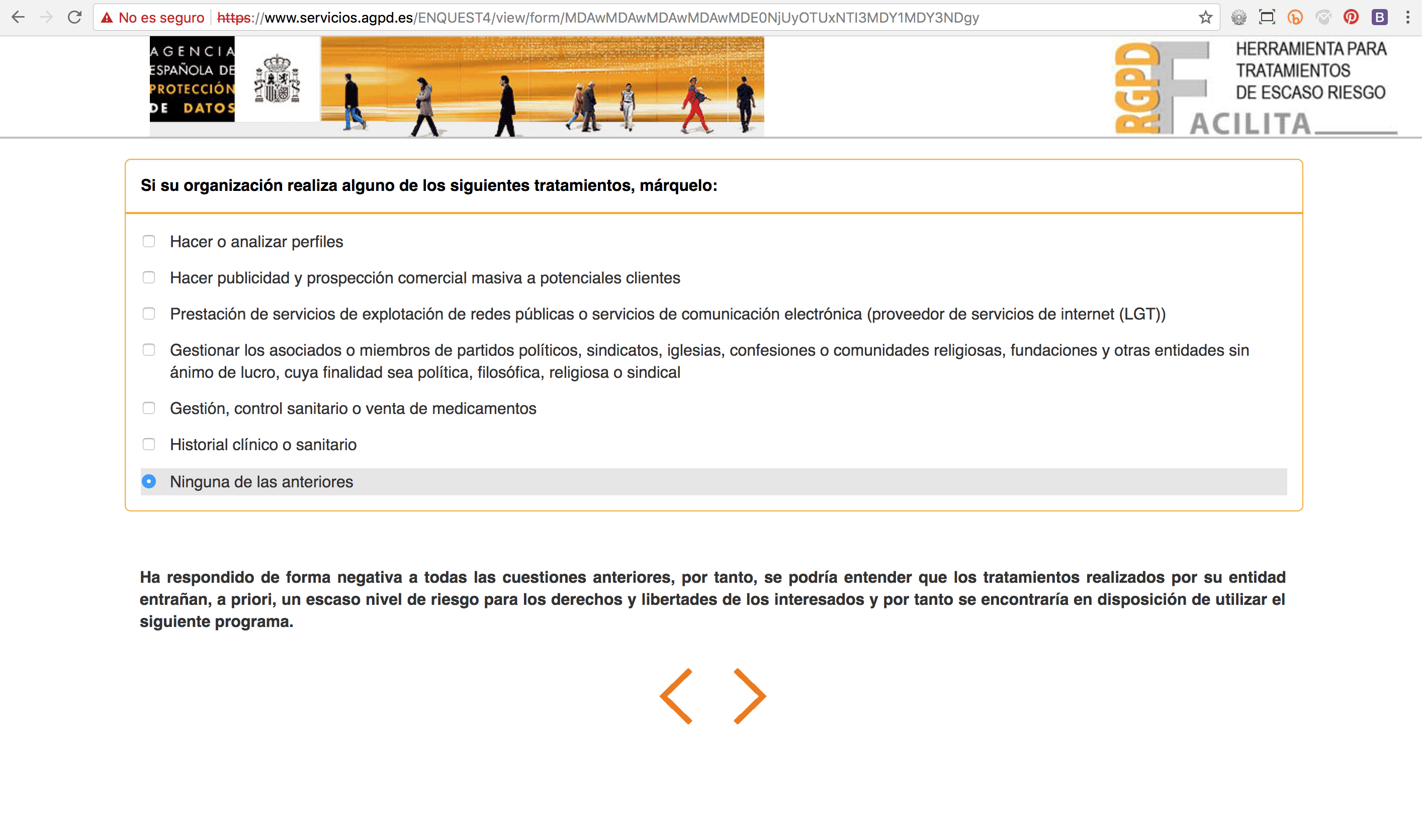 Una vez accedes al formulario, si en las tres primeras cuestiones respondes de forma negativa (Ninguna de las anteriores) , el sistema entenderá que lo tratamiento de datos realizados por tu entidad o persona, a priori, se encuentra en un escaso nivel de riesgo para los derechos y libertades de los interesados y por tanto, puedes seguir utilizando el programa. Si detecta que tu nivel es mayor, te indicará que ese programa no es el idóneo para obtener textos legales para tu negocio.