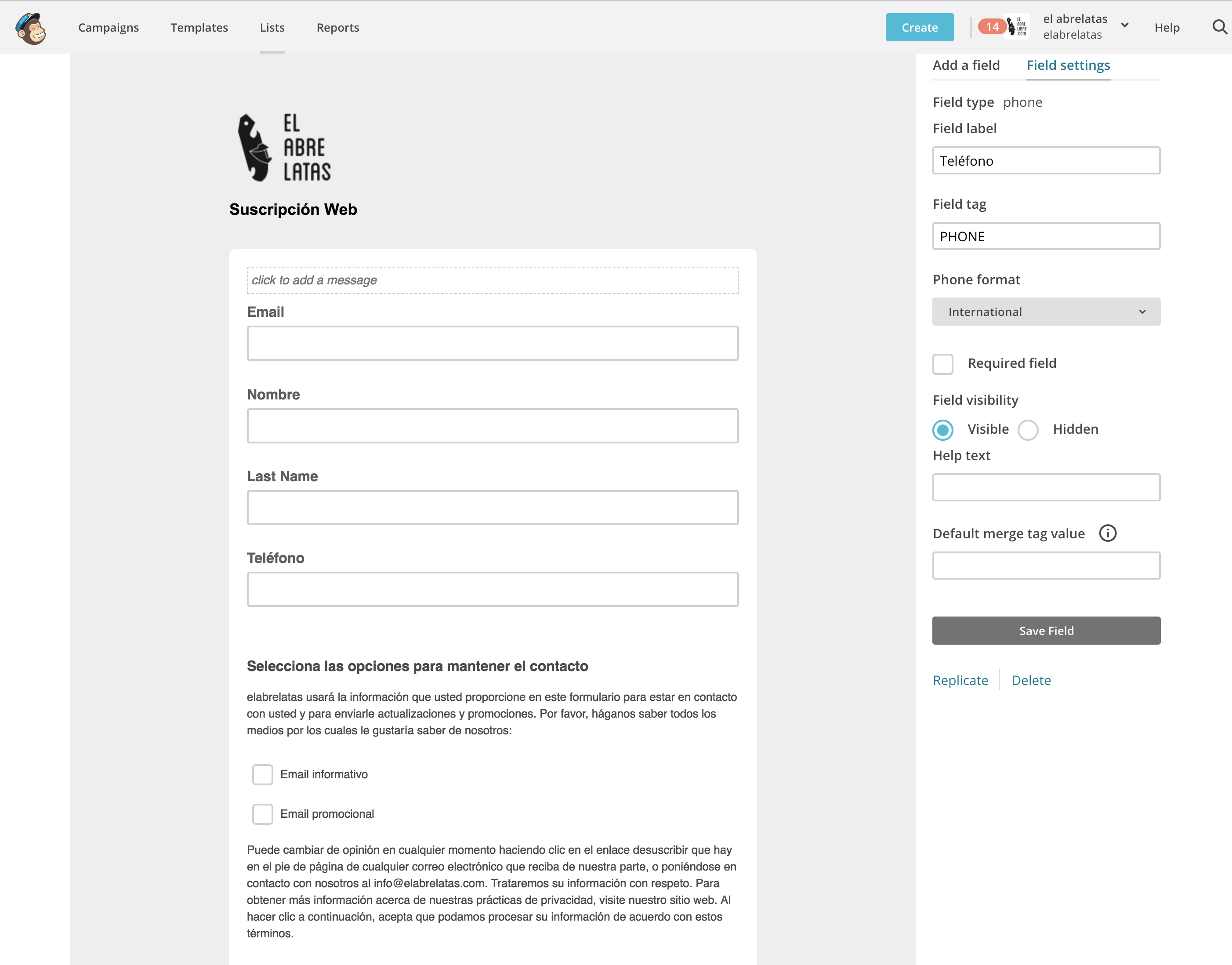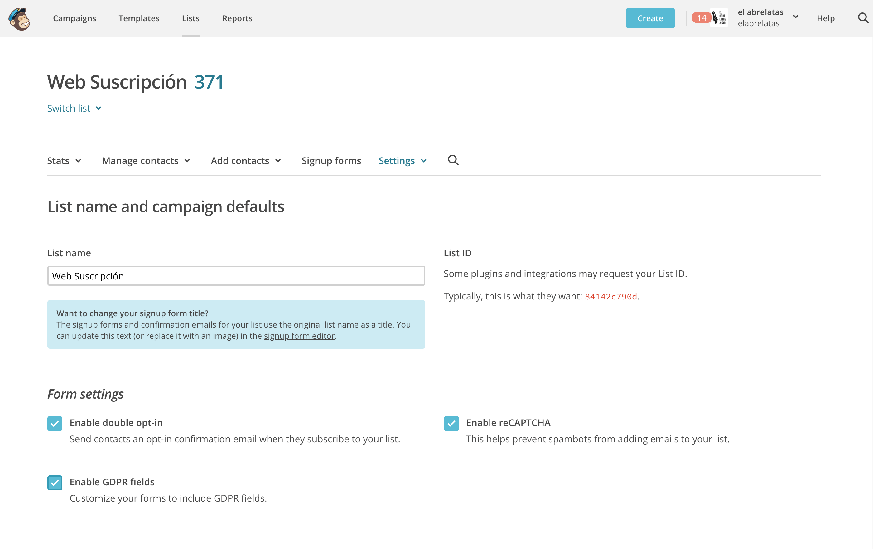 Para activar las herramientas para cumplir con el nuevo reglamento deberás de acceder a cada lista que tengas en tu cuenta y modificar varias opciones: