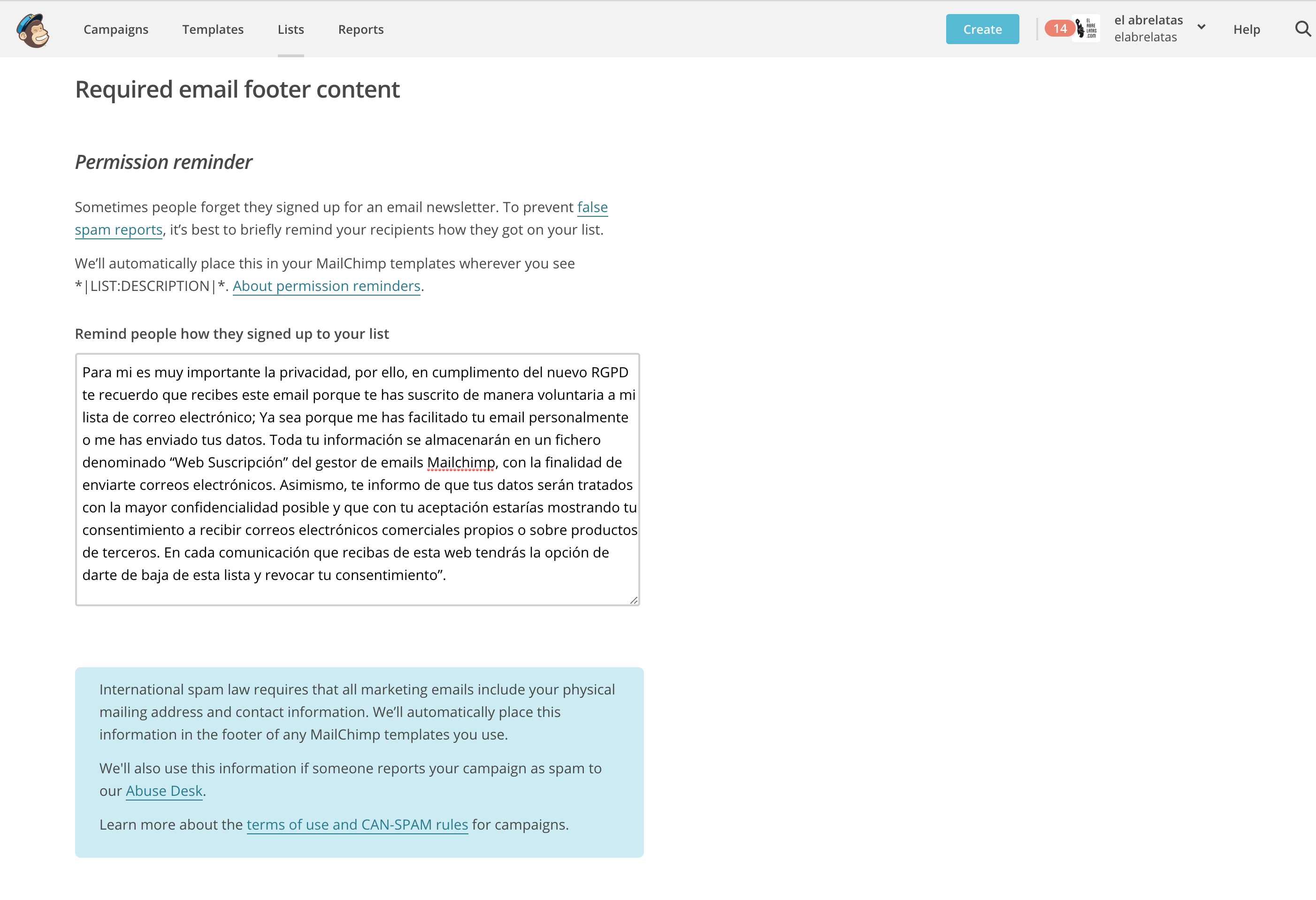 Otra de las cosas a las que me he tenido que enfrentar es el poner al día el servicio del email marketing que en mi caso es Mailchimp. Este gestor de email marketing está lo suficientemente preparado para poder hacer frente a esta legislación.